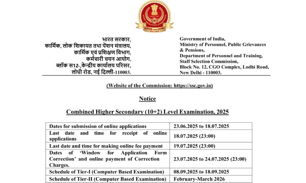 SSC CHSL Recruitment: Staff Selection Commission (SSC) के द्वारा ली जाने वाली Combined Higher Secondary Level (CHSL) की परीक्षा के भर्ती 2025 के लिए आधिकारिक अधिसूचना जारी कर दी गई है। यह परीक्षा हर साल केंद्र सरकार के विभिन्न विभागों, मंत्रालयों और कार्यालयों में भर्ती के लिए आयोजित की जाती है, जिसका उद्देश्य 12वीं पास युवाओं को सरकारी नौकरियों का अवसर प्रदान करना है।